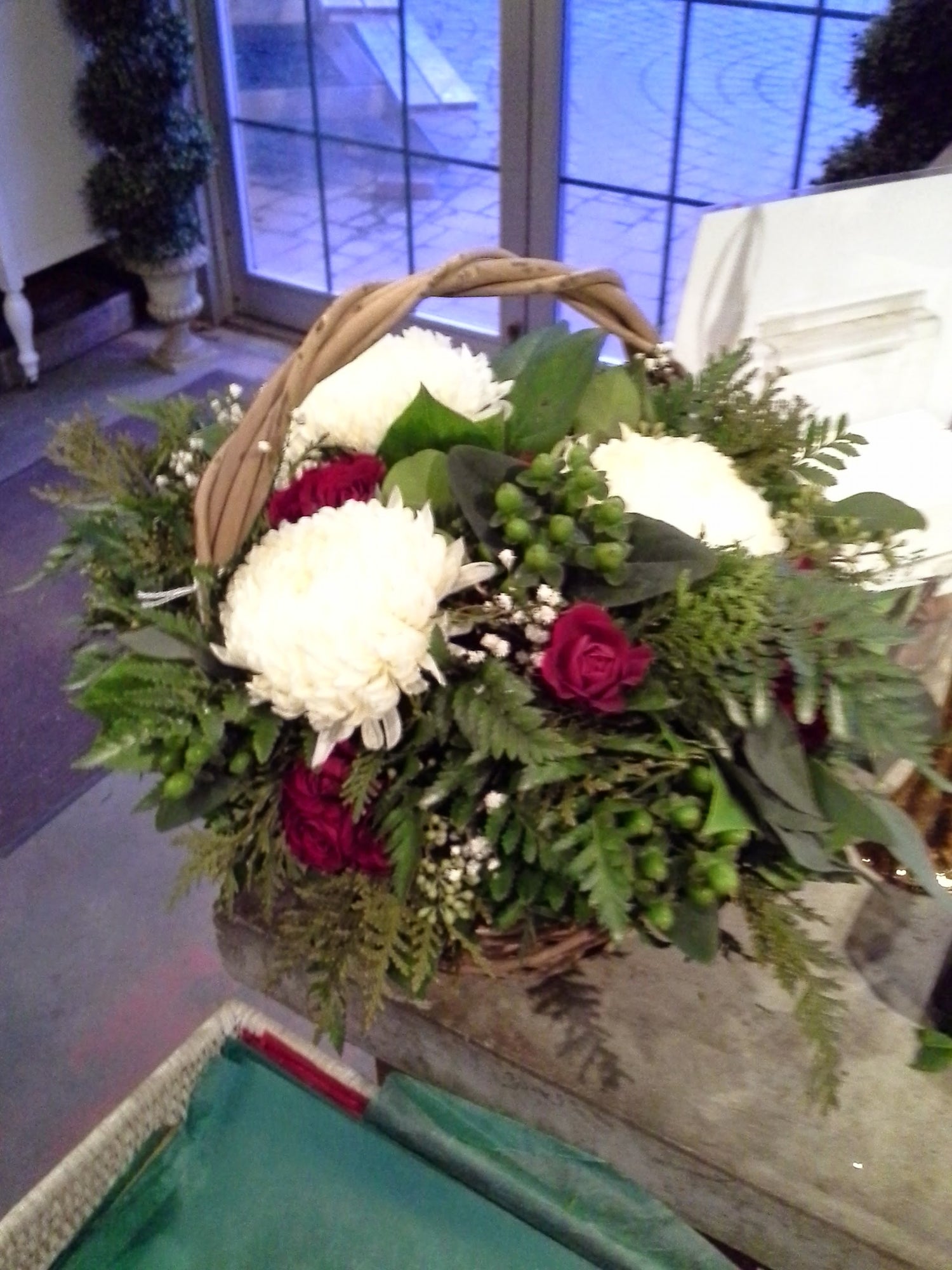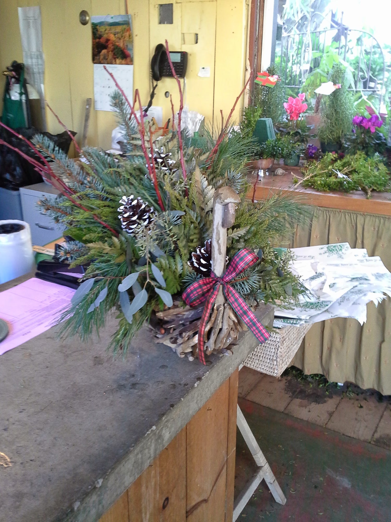 Custom designs can be made to order with containers of any kind that you may already have and would like to use for your holiday. We can pick it up at your convenience fill it and bring it back. Of course, we can also provide a container suitable for the arrangement if you wish.